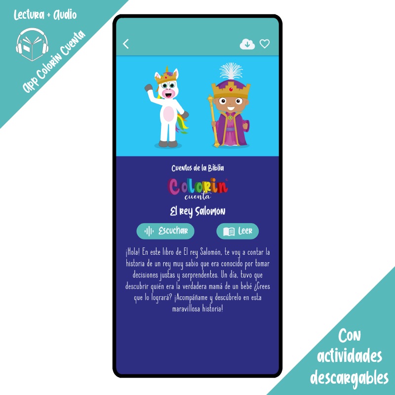 ¡Hola! Soy Colorin el Unicornio, en Colorin cuenta El rey Salomón, te voy a contar la historia de un rey muy sabio que era conocido por tomar decisiones justas y sorprendentes. Un día, tuvo que descubrir quién era la verdadera mamá de un bebé. ¿Crees que lo logrará? ¡Acompáñame y descúbrelo en esta maravillosa historia!
