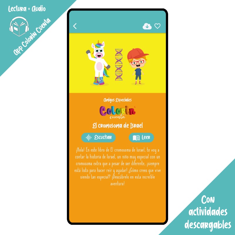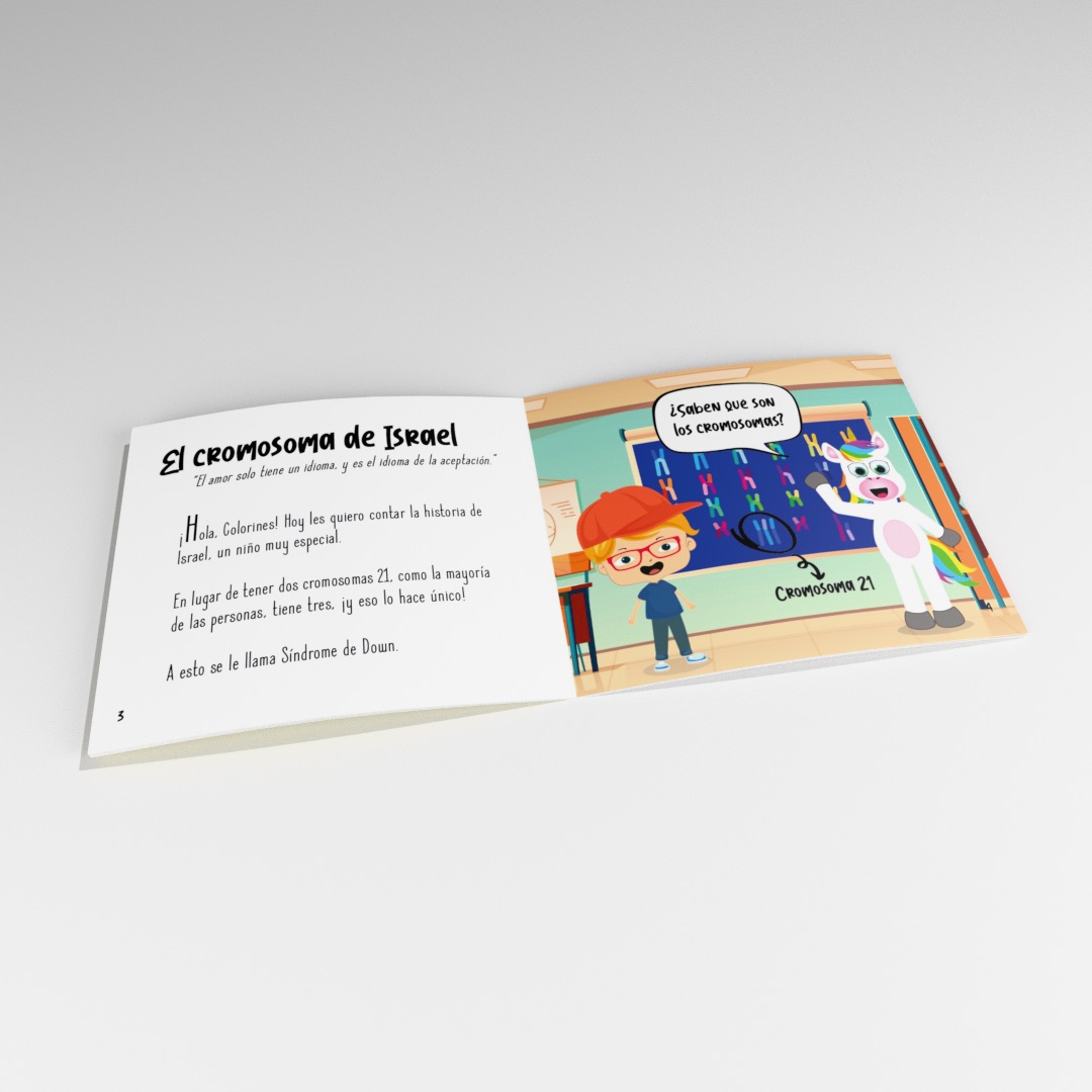 ¡Hola! Soy Colorin el Unicornio, en este minilibro de Colorin cuenta El cromosoma de Israel, te voy a contar la historia de Israel, un niño muy especial con un cromosoma extra que a pesar de ser diferente, ¡siempre está listo para hacer reír y ayudar! ¿Cómo crees que vive siendo tan especial? ¡Descúbrelo en esta increíble aventura!