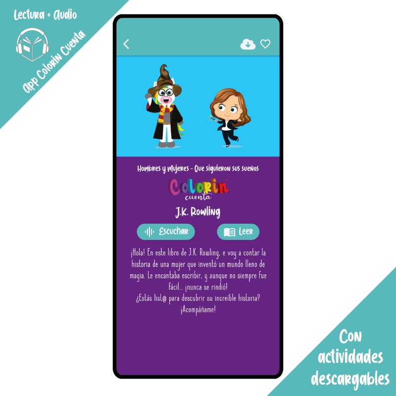 ¡Hola! Soy Colorin el Unicornio, en Colorin cuenta J.K. Rowling, e voy a contar la historia de una mujer que inventó un mundo lleno de magia. Le encantaba escribir, y aunque no siempre fue fácil… ¡nunca se rindió!